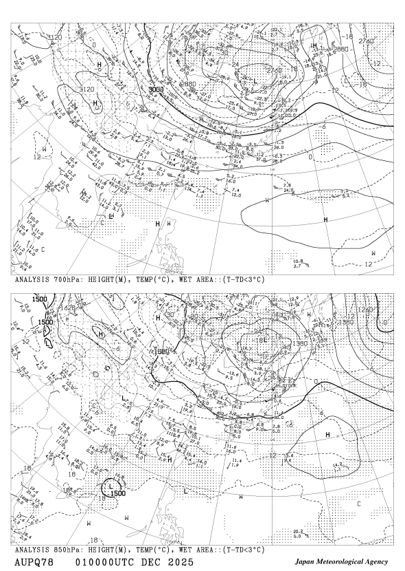 HOME > 専門天気図 AUPQ78 > AUPQ78 アジア850hPa 700hPa解析図