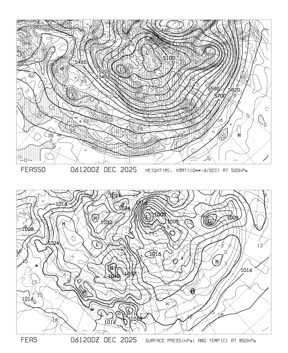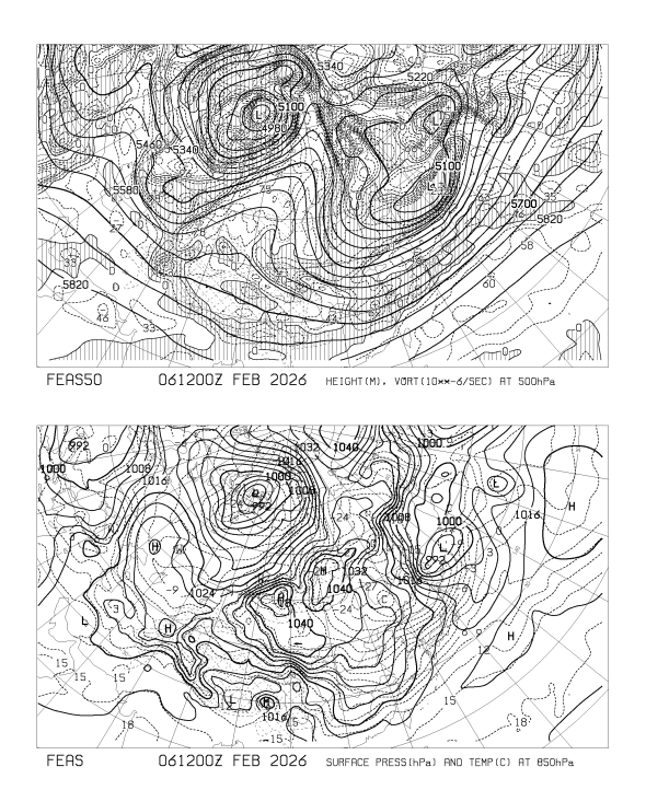 HOME > 専門天気図 FEAS50 > FEAS50 アジア地上気圧 850hPa気温 500hPa高度・渦度