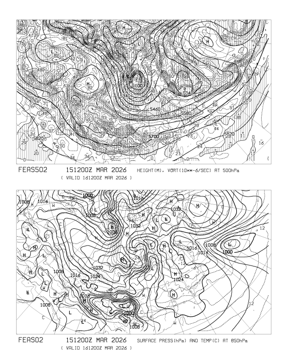 HOME > 専門天気図 FEAS502 > FEAS502 アジア地上気圧 850hPa気温 500hPa高度・渦度 24時間予想