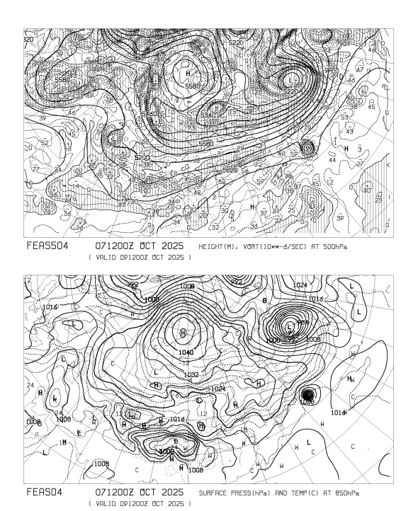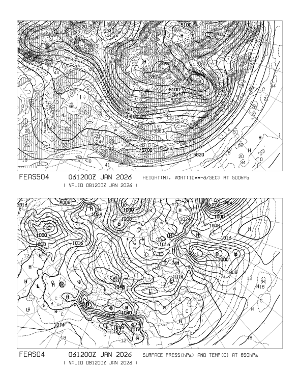 HOME > 専門天気図 FEAS504 > FEAS504 アジア地上気圧 850hPa気温 500hPa高度・渦度 48時間予想