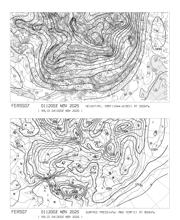 HOME > 専門天気図 FEAS507 > FEAS507 アジア地上気圧 850hPa気温 500hPa高度・渦度 72時間予想