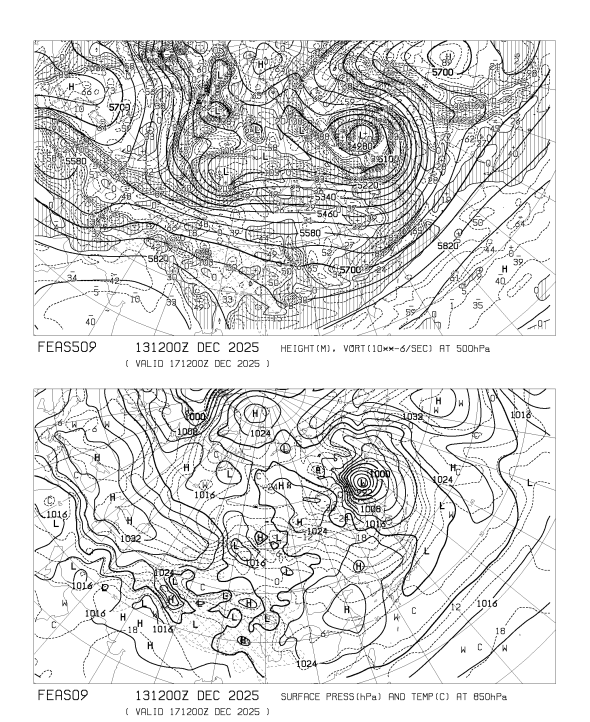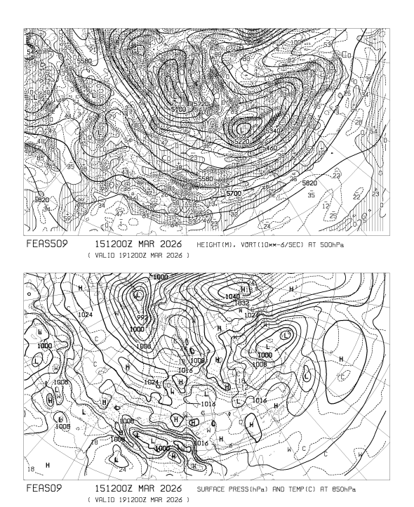 HOME > 専門天気図 FEAS509 > FEAS509 アジア地上気圧 850hPa気温 500hPa高度・渦度 96時間予想