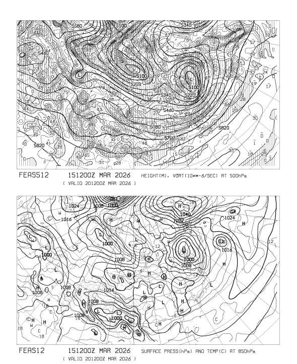 HOME > 専門天気図 FEAS512 > FEAS512 アジア地上気圧 850hPa気温 500hPa高度・渦度 120時間予想