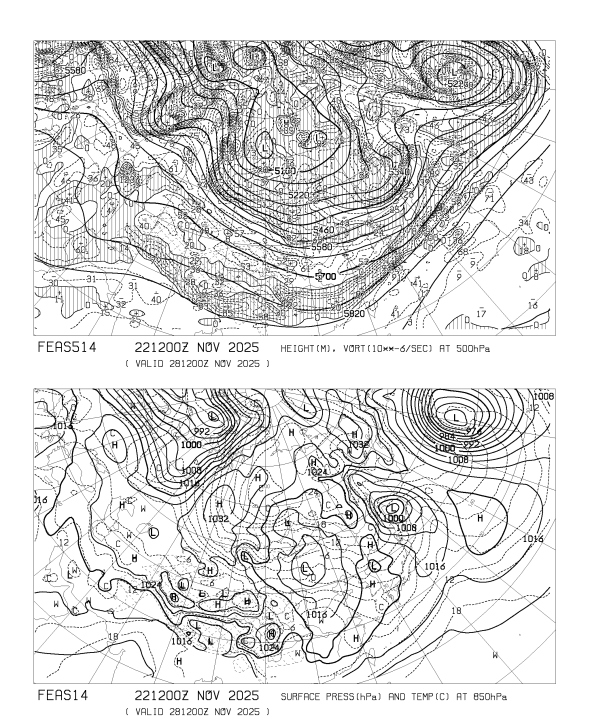 HOME > 専門天気図 FEAS514 > FEAS514 アジア地上気圧 850hPa気温 500hPa高度・渦度 144時間予想