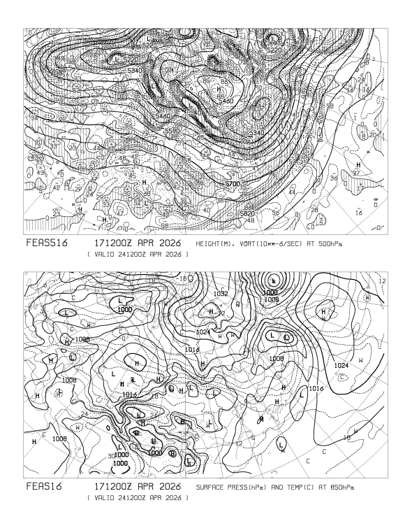 HOME > 専門天気図 FEAS516 > FEAS516 アジア地上気圧 850hPa気温 500hPa高度・渦度 168時間予想