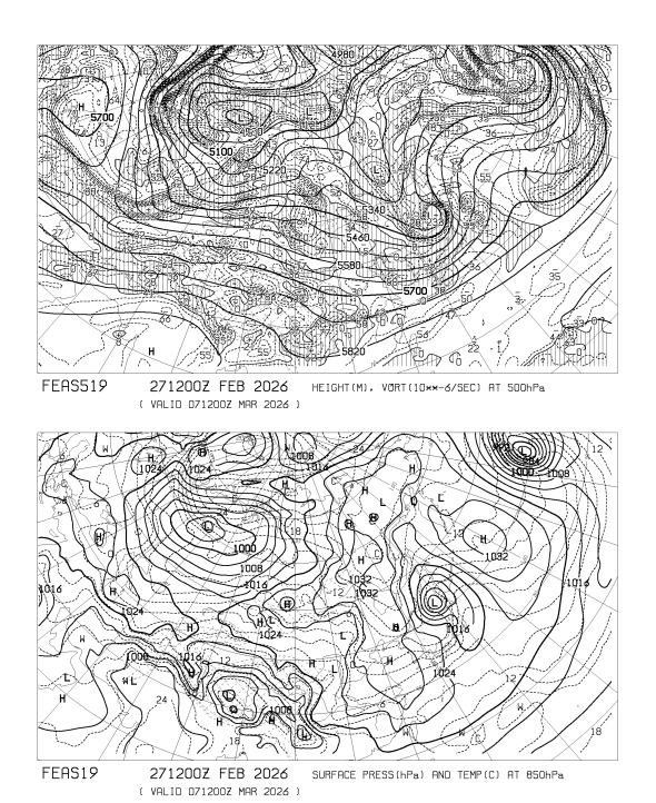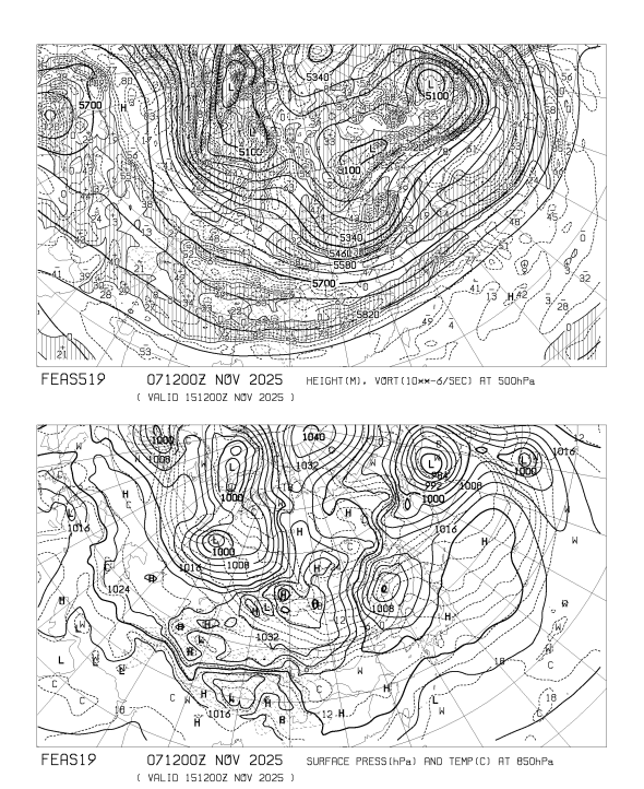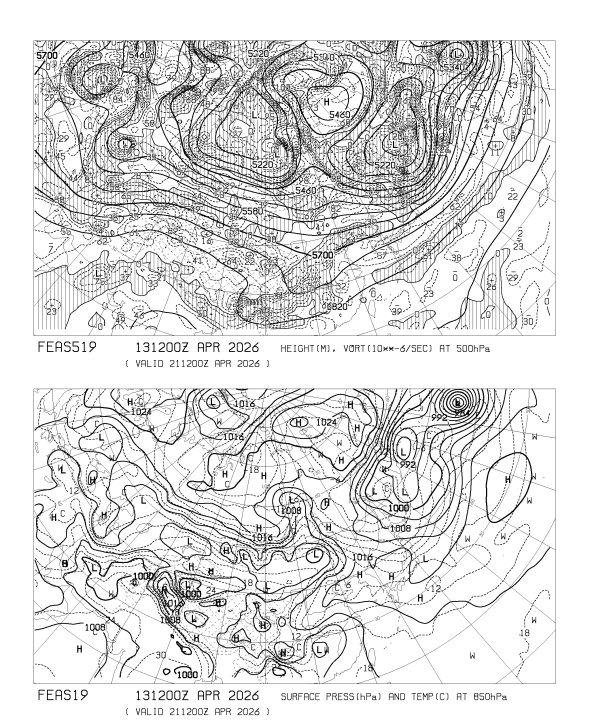 HOME > 専門天気図 FEAS519 > FEAS519 アジア地上気圧 850hPa気温 500hPa高度・渦度 192時間予想