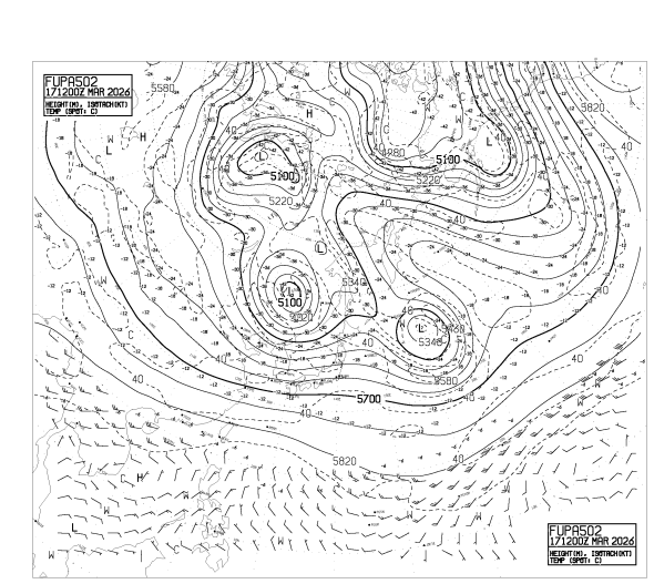 HOME > 専門天気図 FUPA502 > FUPA502 アジア太平洋500hPa 高度・気温・風 24時間予想
