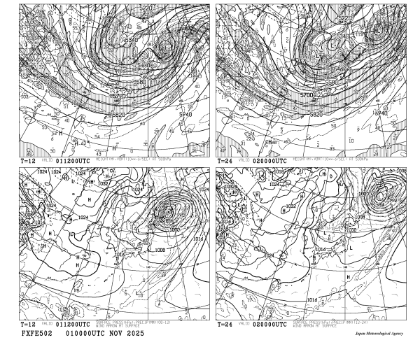 HOME > 専門天気図 FXFE502 > FXFE502 極東地上気圧・風・降水量 500hPa高度・渦度 12・24時間予想
