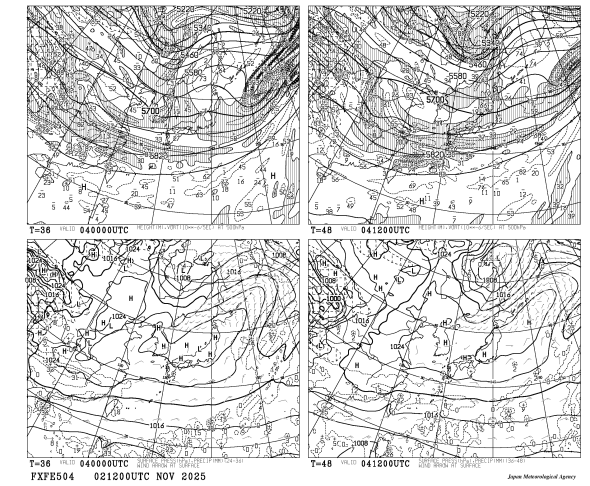 HOME > 専門天気図 FXFE504 > FXFE504 極東地上気圧・風・降水量 500hPa高度・渦度 36・48時間予想