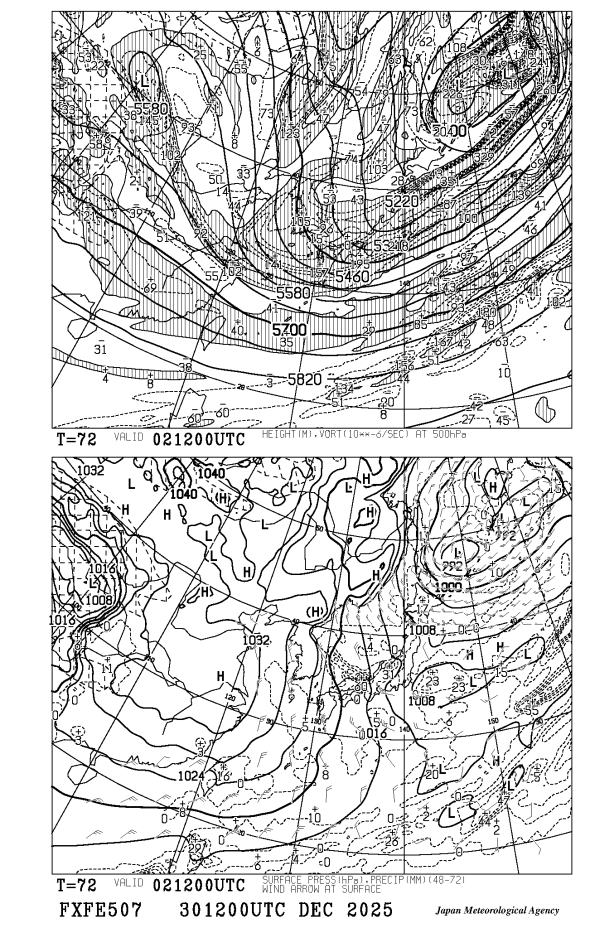 HOME > 専門天気図 FXFE507 > FXFE507 極東地上気圧・風・降水量 500hPa高度・渦度 72時間予想