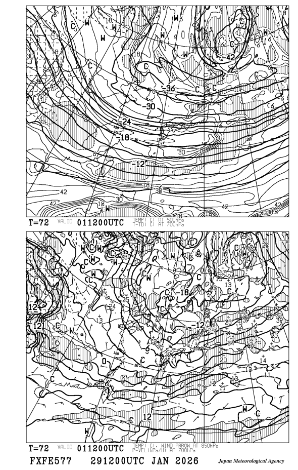 [FXFE577] 極東850hPa気温・風 700hPa上昇流・湿数 500hPa気温 72時間予想