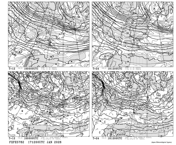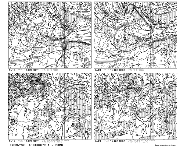 [FXFE5782] 極東850hPa気温・風 700hPa上昇流・湿数 500hPa気温 12・24時間予想