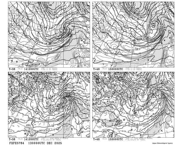 [FXFE5784] 極東850hPa気温・風 700hPa上昇流・湿数 500hPa気温 36・48時間予想
