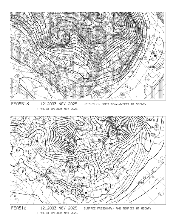 HOME > 専門天気図 FEAS516 > FEAS516 アジア地上気圧 850hPa気温 500hPa高度・渦度 168時間予想